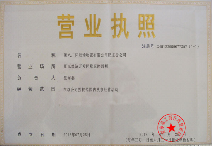 衡水广怀运输物流有限公司肥东分公司营业执照(正本)
